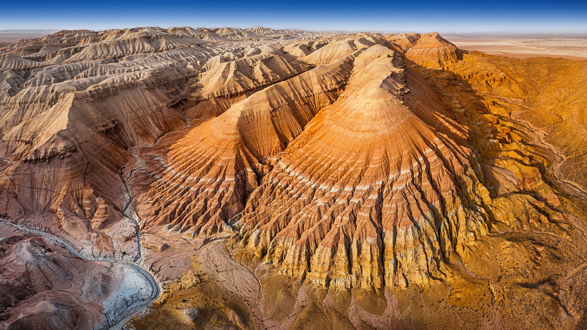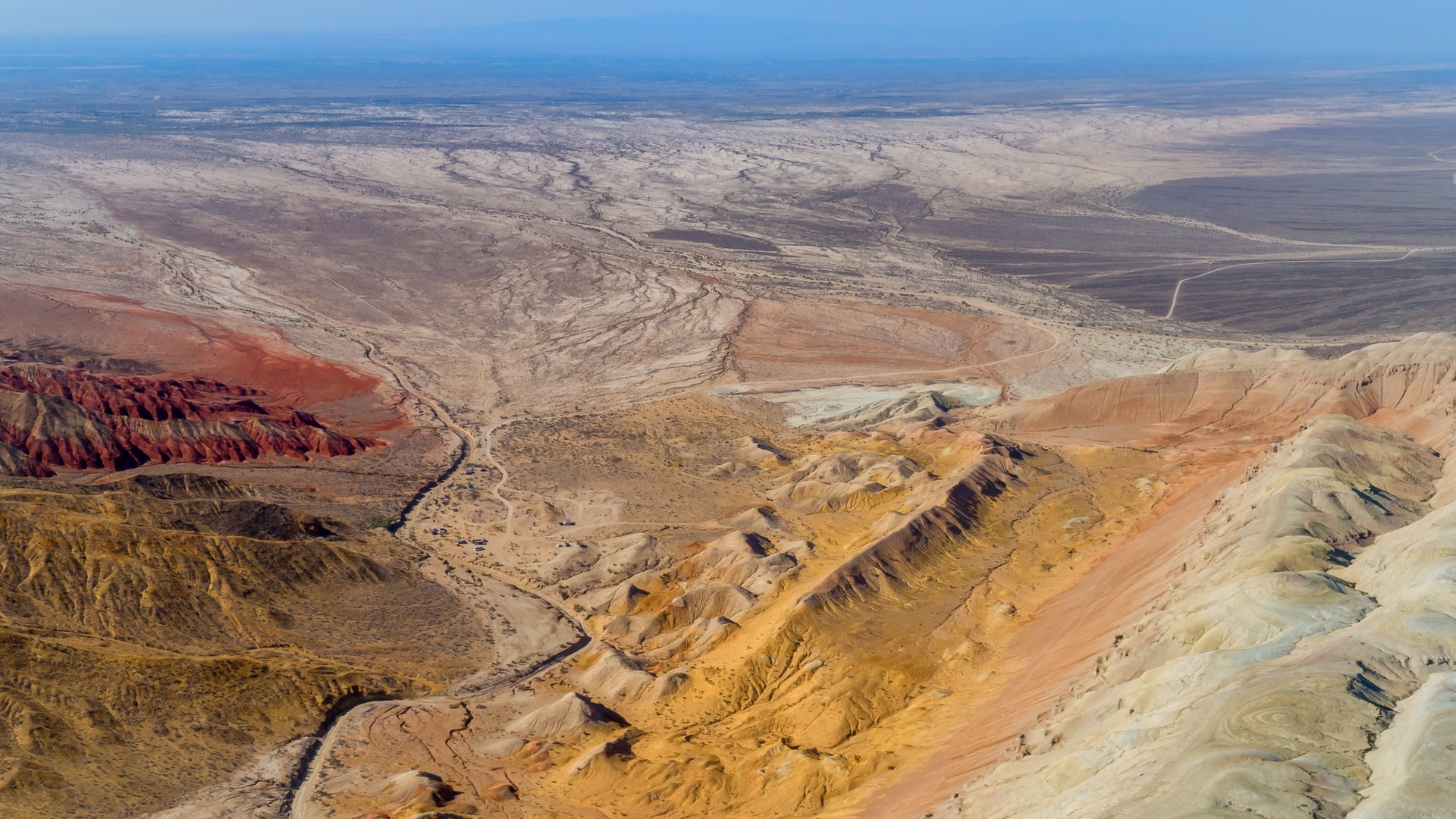 You will begin your morning with breakfast at the hotel before checking out and starting your journey toward the Aktau White Mountains, which is located about 90 kilometres away. When you arrive, you step into a landscape shaped roughly 400 million years ago, where striking chalk formations dominate the scenery. From above and during a closer hike, you notice slopes tinted not only white but also soft shades of blue, pink, red, and green.