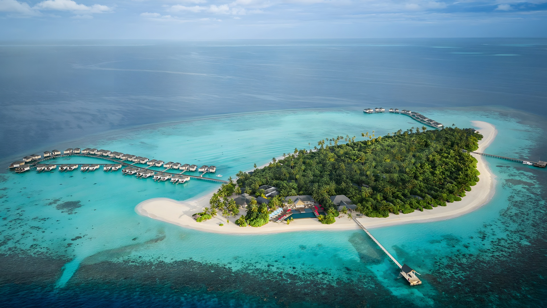 The resort comprises 120 spacious and stylish villas, half beautifully positioned over the shimmering lagoon and half along the shoreline. Each villa is designed with contemporary Maldivian influences, modern comforts such as complimentary Wi-Fi, and a private deck perfect for watching unforgettable sunrises or sunsets. Many accommodations also feature plunge pools, direct beach or lagoon access, and open-air bathrooms that celebrate the island setting.