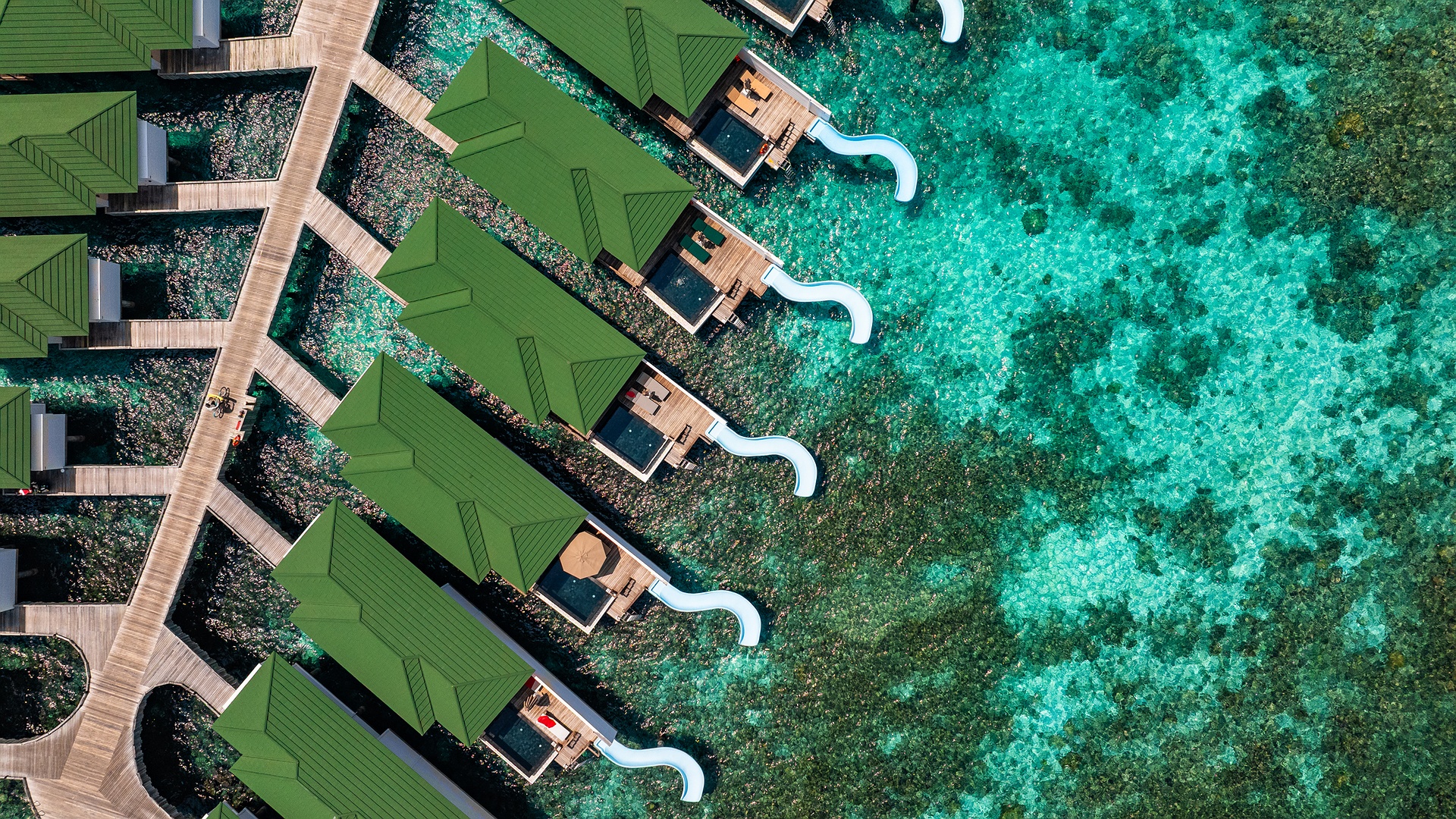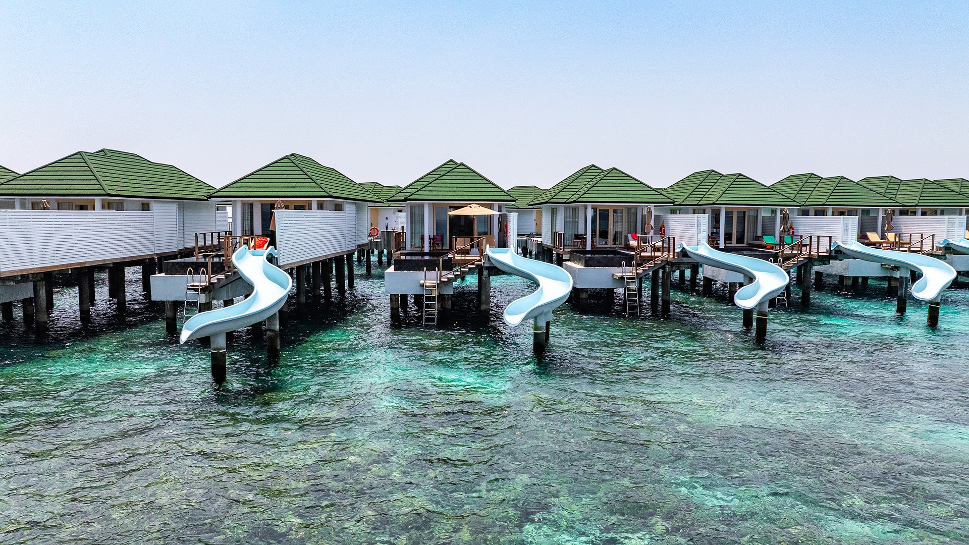 The Water Pavilion with Pool + Slide is the perfect choice for those who seek ultimate privacy. A whopping 179 sqm in size, these villas are located at the very end of the jetty, meaning you benefit from an unbelievable panoramic view of the Indian Ocean. Featuring a large private fresh water pool, a slide into the ocean, an outdoor terrace, a separate lounge area, indoor and outdoor showers plus the standard mini-bar, Wi-Fi and direct access to the ocean.